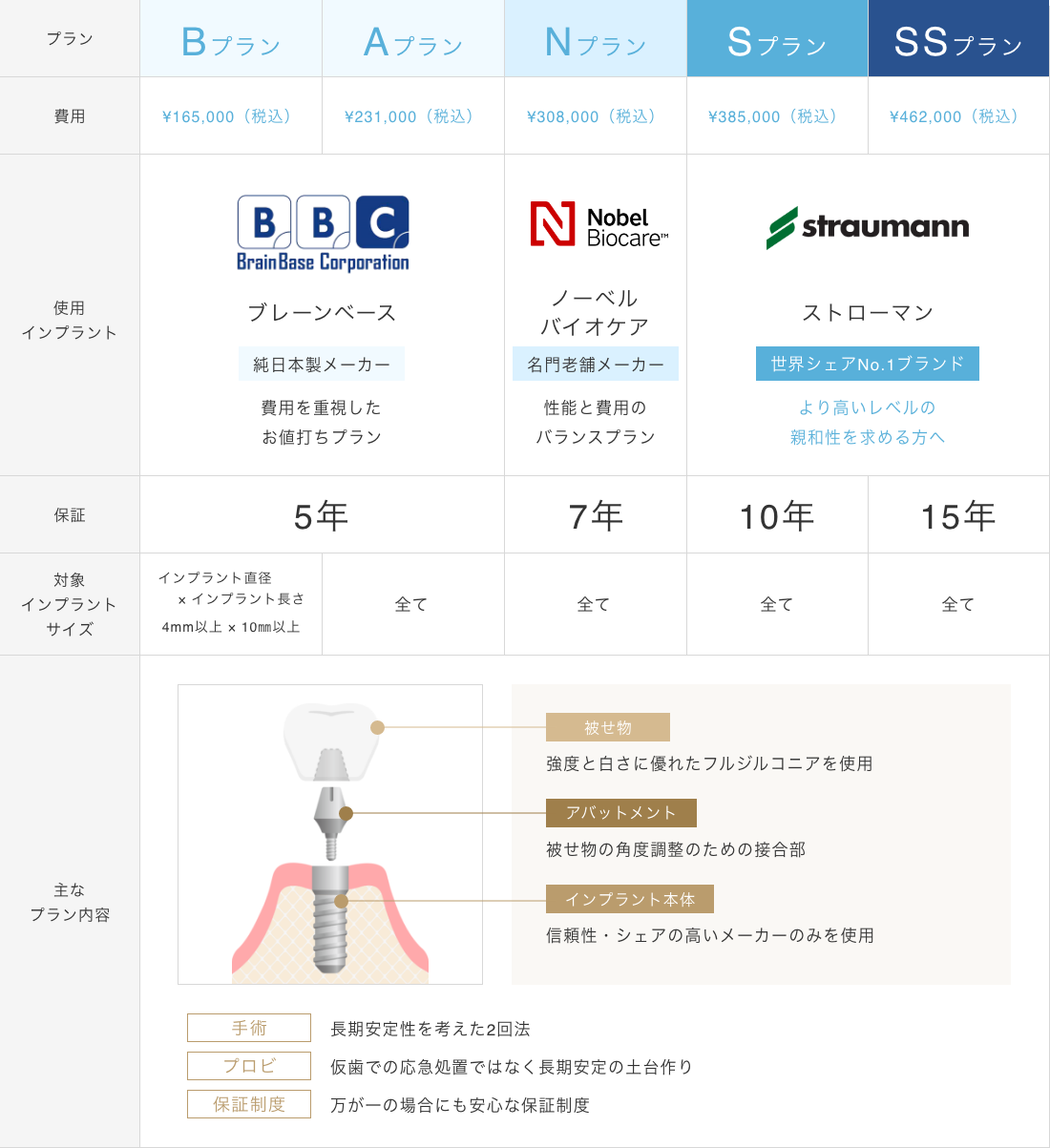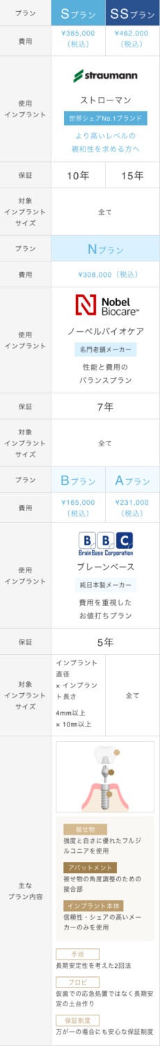 保証の期間とインプラントのメーカーの違いが、プラン(費用)の違いです。
