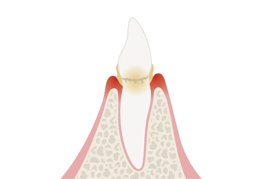 歯周病の初期段階です。歯ぐきの炎症で粘膜が敏感になっていて、赤く腫れたり、痛みがある場合や歯磨きの時に出血することがあります。 まだ歯周ポケットが浅く、歯を支える骨へのダメージは少ないので、この段階で治療すれば、元の健康な状態に戻しやすい状態です。