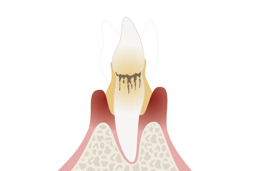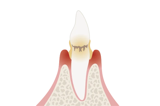 歯周病が進行し、歯を支えるが骨が半分程度溶かされた段階です。 歯周ポケットがさらに深くなり、歯のぐらつくようになり、膿が出てきたり口臭が気になるようになります。