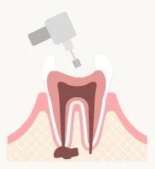 まず細菌の侵入した歯の神経(歯髄/しずい)を除去します。むし歯や知覚過敏などで刺激が与えられ続ける事により歯髄炎という炎症が起こり、痛みを引き起こします。一度、歯髄炎になってしまったら自然治癒はせず、放置すれば悪化してしまうので、歯髄は除去する必要があります。これを抜髄(ばつずい)といいます。